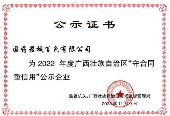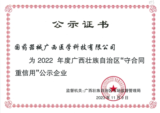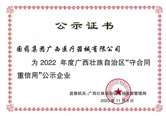國藥集團(tuán)廣西醫(yī)療器械有限公司及所屬子公司表示,未來將堅(jiān)持“守合同重信用”的企業(yè)形象,秉承“責(zé)任、誠信、專業(yè)、創(chuàng)新、共贏”的企業(yè)核心價(jià)值觀,持續(xù)發(fā)揮示范性作用,進(jìn)一步弘揚(yáng)誠實(shí)守信精神,打造一流企業(yè)信用品牌,穩(wěn)步推進(jìn)公司經(jīng)營邁向高質(zhì)量發(fā)展的新臺階。